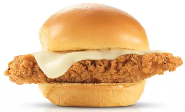 Arby’s uses a crispy breaded chicken tender served on a slider bun. The tender is made from white meat and fried to a crunchy golden finish.