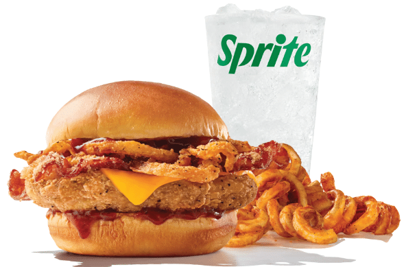 The Arby’s Bourbon BBQ Chicken Sandwich Meal features a crispy chicken fillet topped with rich bourbon BBQ sauce, brown sugar bacon, crispy onions, and cheddar cheese, all nestled in a toasted star top bun. This meal is known for its sweet and savory flavor profile, making it a customer favorite.