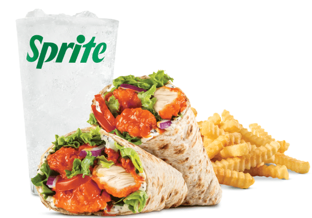 The Crispy Buffalo Chicken Wrap Meal at Arby’s features crispy chicken tenders, shredded lettuce, red onion, buffalo sauce, and parmesan peppercorn ranch all wrapped in a soft tortilla. Served with curly fries and a drink, this meal delivers a bold, spicy punch with every bite.