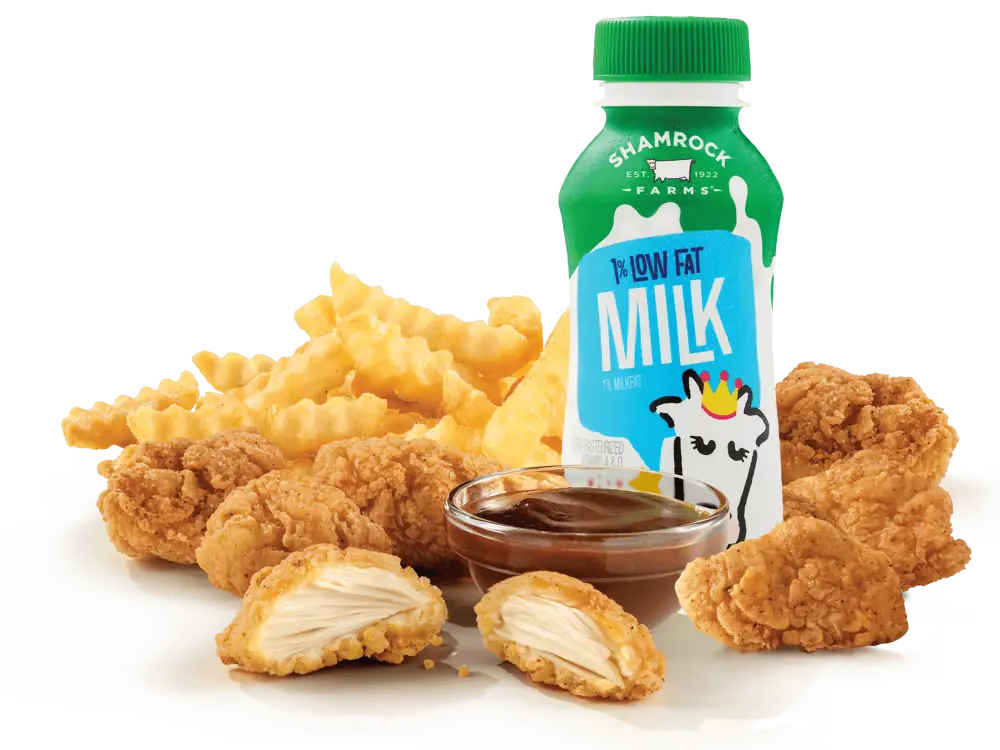The meal typically includes 6 crispy chicken nuggets, a side like curly fries or applesauce, and a kid’s drink such as milk, juice, or bottled water.